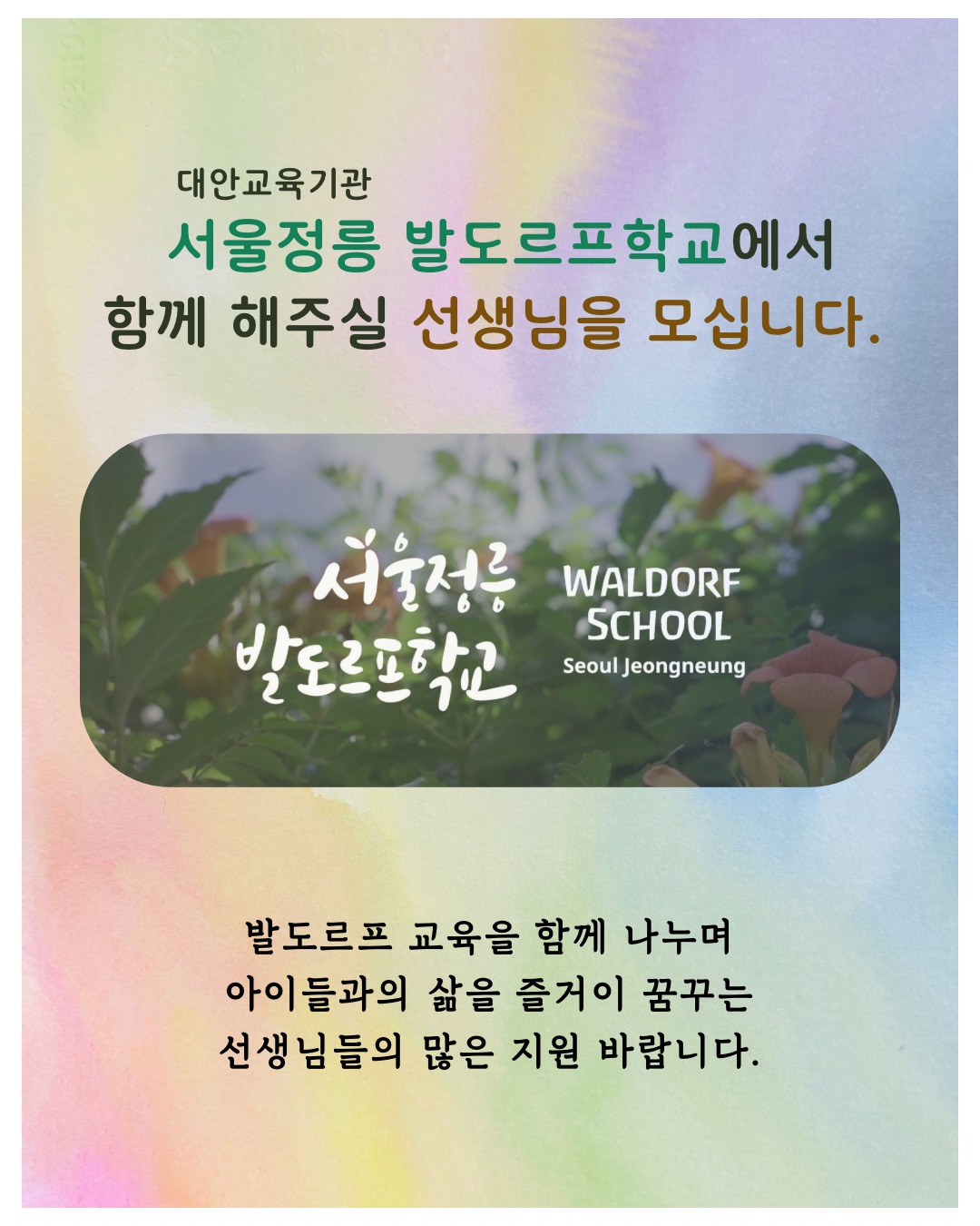 서울정릉 발도르프학교에서 함께해 주실 선생님을 모십니다. 발도르프 교육을 함께 나누며 아이들과의 삶을 즐거이 꿈꾸는 선생님들의 많은 지원 바랍니다.